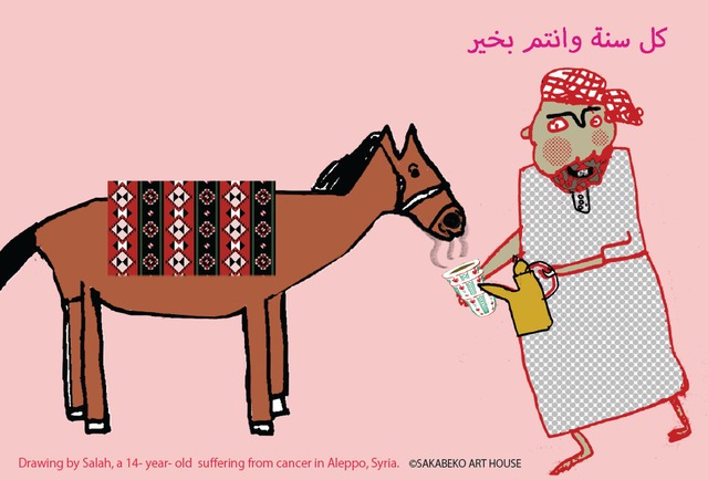 ポストカード 上質紙 裏面無地 10枚セット 2021年、シリアの青年から手術が必要!助けてほしいというSOSからスタートした国際協力年賀状。昨今の年賀状離れもあり、昨年終了しました。しかしながら、続けてほしいという要望もありまして、それならばとポストカードにも使えるように、先日アレッポを訪問した時にサラーハくんに描いてもらった絵を使うことにしました。しかし馬の絵がない。そういえば12年前の馬年にイラクのシリア難民の子に描いてもらった絵を思い出し組み合わせてデザイン。テーマは、「アラブ人のおもてなし」アラブのおっさんが、あけましておめでとうと言って馬にコーヒーをあげて歓迎しています。SAKABEKOでは毎月25000円の支援をサラーハ君に送っています。今後も継続していくためにご協力お願いします。 裏面は無地ですので、ご自由に印刷等できます。光沢を抑えた上質紙を使用しており今まで以上に裏面は文字が書きやすくなっています。